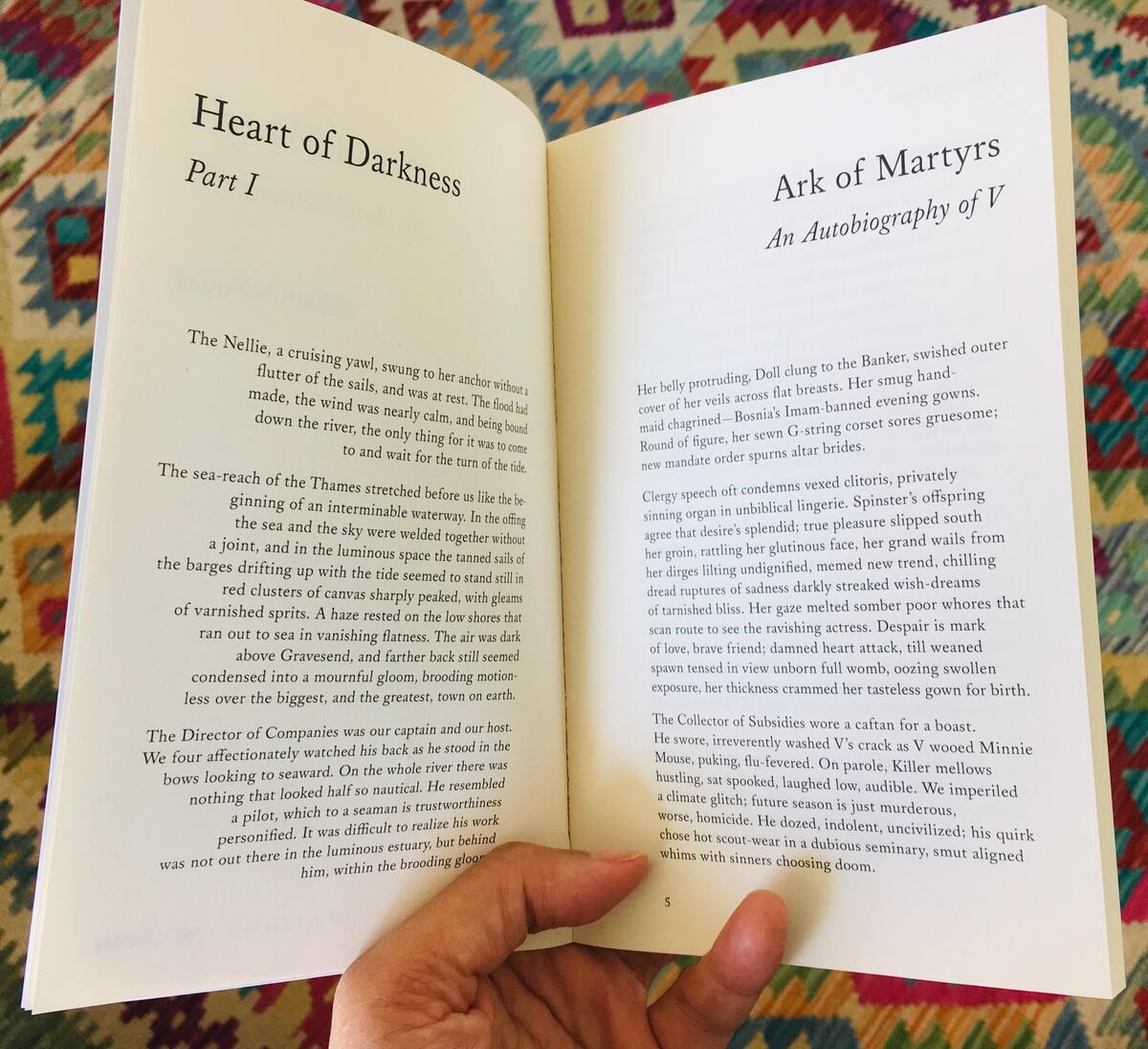 Published in the throes of Covid-19, Ark of Martyrs is Art Professor Allan deSouza’s rewriting of the first part of Joseph Conrad’s 1899 novella, Heart of Darkness. In the vocal traditions of gospel, toasting, and rap, deSouza replaces Conrad’s words with ones that loosely rhyme to form an autobiography of V whose story consists of the mental chatter, unspoken and unspeakable desires, avarice, anxieties, and political resentments of guests at a wedding party on a cruise ship that’s adrift and under quarantine. The book is available to order online at SmingSming Books.