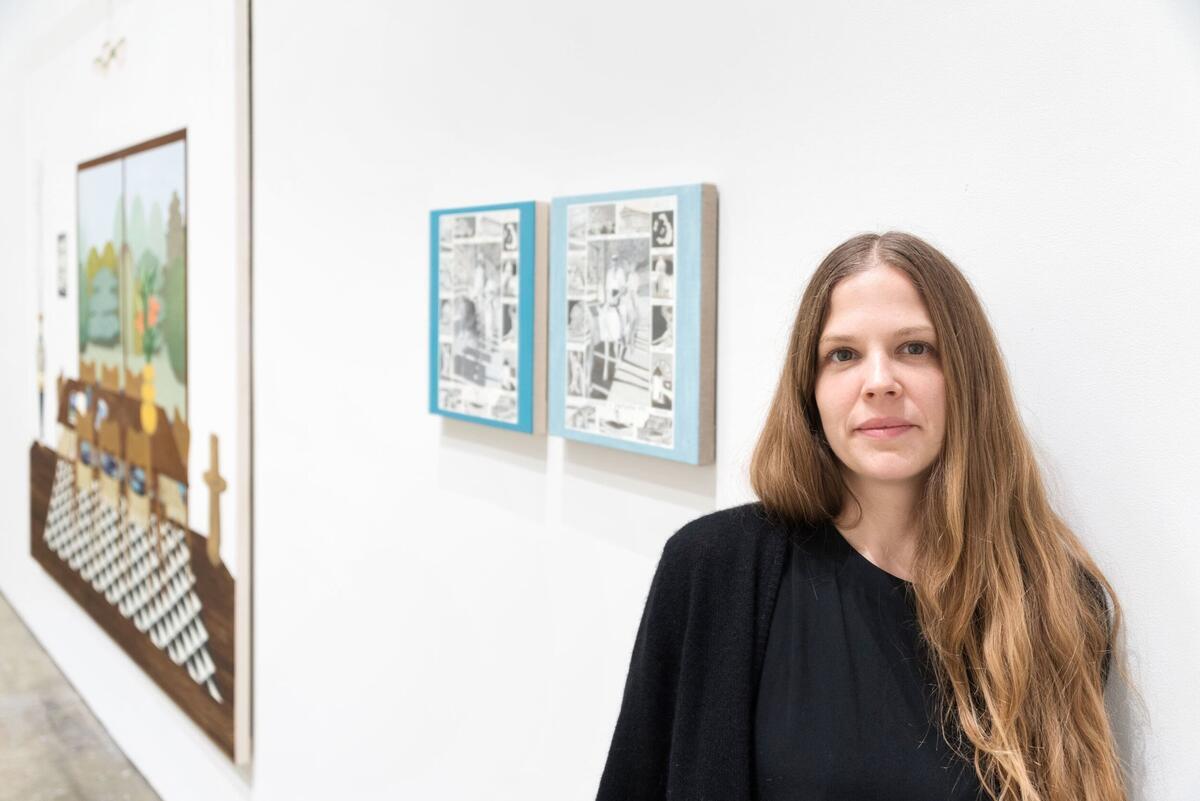 “[..]Becky Suss’s paintings can be deceptively simple. “I’ve always been a stacker and a flattener,” she told me. She works large—most of her paintings are around seven feet tall, and some five feet or more wide—and she uses pattern and distorted perspective to explore how memory alters the shape of domestic spaces that one once knew, or imagined, intimately. Suss is an enthusiastic champion of representational painting, but she insists that her work is “not a window.” Scale and distortion are two ways for her to kindle this realization in a viewer: to bring them back to the object in front of them. But they also, she offers, “validate the distortions of remembering. So instead of thinking of a distorted image in your mind as a lapse in memory or a misremembering—no, these distortions are the story.”